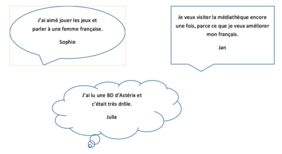Als Einstieg wurde ein Kurzfilm über den Tätigkeitsbereich des französischen Kulturinstituts gezeigt. Nachdem Mme Anne Pochard, die Bibliothekarin, dann mit den SchülerInnen eine kurze Überblicksführung in der médiathèque durchgeführt hatte, mussten sie jeweils ein Medium (ein Buch, ein BD, eine DVD, …) auswählen und dann der Gruppe ihre Wahl präsentieren.